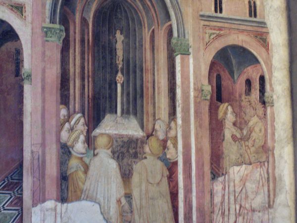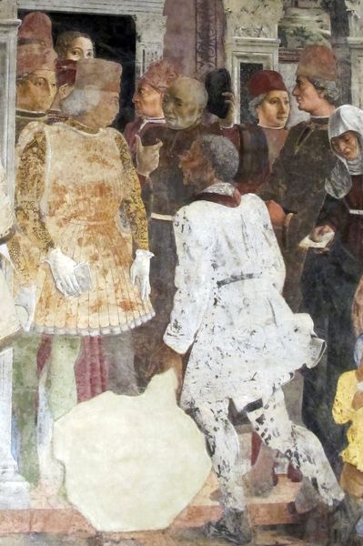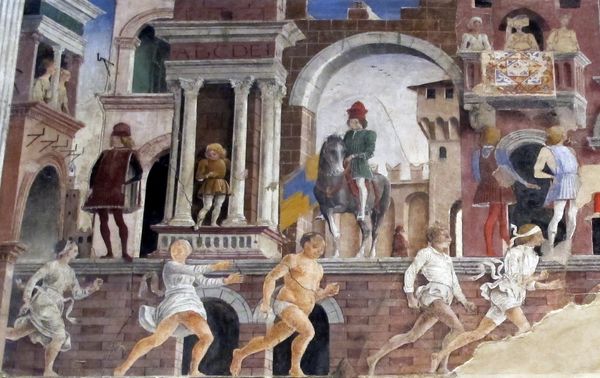 Editor: This is a detail from "April: Frescos in Palazzo Schifanoia" from around 1470 by Francesco del Cossa. The materials, as indicated, are frescos. The artist has depicted figures in what looks like a staged environment, and the garments almost appear real! What can you tell me about it from your perspective? Curator: Considering the materiality, this fresco offers us a window into the labour practices of the time. Observe how the pigments were sourced and applied, reflecting the patronage system and the social status linked to certain materials. Think about the layers of plaster, the grinding of pigments, the very hands that built this narrative on the wall, revealing a world where art and craft are not separated, but rather intertwined within the same mode of production. Editor: That is quite interesting. I didn't initially see the labor, but it is inherent to its very existence. Is that what you find most intriguing about it? Curator: Exactly. Look at how the clothing indicates wealth; what dyes were used, the labour required to produce that cloth. And this wasn't mere decoration. This palace was a place of work and this image serves to reinforce a particular social order through its ostentatious display. Also note the building within the painting; that had to be rendered precisely using knowledge from architecture specialists of the period, reflecting its material reality. Editor: Fascinating how that one element, frescos, and material choices open up these diverse discussions! I have something to think about now when looking at Renaissance art. Curator: Yes, stepping beyond purely aesthetic considerations unveils a far richer understanding.