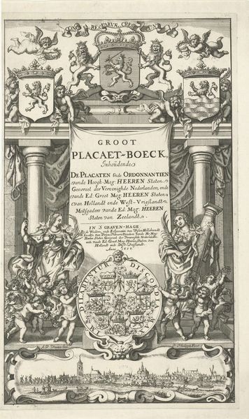 Editor: Here we have a print from 1639, "Julius Civilis en Willem van Oranje," currently housed at the Rijksmuseum. It’s an engraving. My first impression is that it feels very official, like a historical document. There's a lot of symbolism packed in, but what do you see in this piece, that I might be missing? Curator: Indeed! This engraving is more than just a pretty picture; it’s a carefully constructed narrative. The figures on either side of the title, Julius Civilis and William of Orange, aren’t just randomly placed. They are potent symbols, linking ancient Batavian resistance against Rome to the Dutch struggle for independence from Spain. It's a visual argument. Do you notice how the artist connects these two figures across time? Editor: I see they're both standing armed, almost guarding the text. Is that text the main subject then? Curator: The text is central, certainly. The title “Historia Gelrica” suggests it's a historical record of the region of Gelderland. However, consider how the image functions alongside the text. The Batavian Republic, with Civilis as its leader, was often invoked to justify the Dutch Revolt. The engraver is drawing on a well of cultural memory, suggesting a lineage of resistance, imbuing the Dutch struggle with historical legitimacy and moral authority. Do the armorial symbols add more cultural weight? Editor: Ah, that makes sense. The shields held by cherubs must be family crests or seals. So the artist is not just illustrating a history, but making a claim about Dutch identity and independence, very persuasive! Curator: Exactly. And these symbolic figures weren’t universally admired. So the work makes choices to craft its cultural story. Editor: It is remarkable how much a single image, from centuries ago, can still tell us. I’ll definitely be looking closer at those armorial symbols next time!