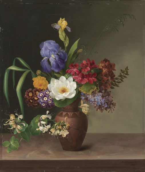Editor: Here we have Peter Binoit's "Still Life with Iris," painted in 1623. The Baroque painting on a panel shows a vase overflowing with colorful blooms. I find it both beautiful and unsettling – there's an almost hyper-realistic quality, but with a certain darkness creeping in, you know? What do you see in this piece that I might be missing? Curator: Oh, absolutely. It's that dance between celebrating life's beauty and acknowledging its fragility, isn't it? Those vibrant flowers are captured with almost scientific precision, but there's an ephemerality hinted at. What catches my eye are the little critters–the insects. Not just decoration, but a memento mori—a reminder that even beauty decays, life is fleeting, the world continues, despite it all. Isn't that rather poetic? Editor: A reminder of mortality...the creeping insects! I see that. So, it's not *just* a pretty picture? Curator: Never is, my dear! Binoit is placing this beautiful bouquet within a broader cycle, an acceptance of what is. It feels almost subversive for its time. Do you think he's simply showing skill or suggesting something more, maybe a comment on human vanity? Editor: I love that idea, a comment on vanity. So, maybe it’s not just *look at these pretty flowers,* but more *look at these pretty flowers and remember you're going to die someday.* Curator: Precisely! Though perhaps delivered with a wink. Editor: I hadn’t thought of it that way, but now that you mention it, it really does shift my perception. So, it's beauty *and* a bit of a gothic edge, a conversation starter, definitely! Curator: Glad to provide you with new vision. All in beauty of its time.