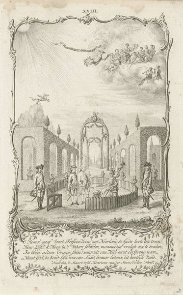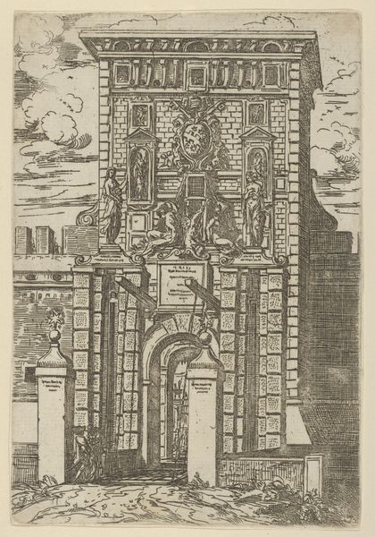Editor: Here we have Giovanni Battista Falda's "Fontein met duiven in de tuinen van Villa Doria Pamphilj te Rome," created sometime between 1653 and 1691. It's an engraving, and what strikes me is the rigid symmetry; it's so structured, yet playful with the water features. How do you approach interpreting this work? Curator: I observe first the linear precision achieved through engraving. The artist employs line weight to delineate form, texture, and spatial depth. Note the architectonic structure – the fountain itself, its careful arrangement of tiers, niches, and water elements – acting as the primary formal element, dictating the composition. Can you see how Falda controls the composition, drawing the eye upwards through balanced levels? Editor: Yes, the repetition of arched forms and the way the water mimics the shapes creates a strong visual rhythm. Are there specific features or details that are structurally significant? Curator: Precisely. Consider the deliberate placement of figures. They populate the foreground and guide our entry into the scene, becoming integral to the spatial structure. The varying textures created through the engraving technique simulate depth and volume in a way that contrasts architectural solidity with ephemeral natural elements, wouldn’t you agree? Editor: Absolutely, the contrast between the solid stonework and the fluid water really enhances the sense of depth. Thanks, I'm noticing how important it is to observe the artist's handling of the medium to decipher the artwork's form. Curator: Indeed. We often overlook the basic language that underlies so much artistic meaning. Paying close attention to the formal composition yields insightful avenues for a much deeper appreciation of the image as a constructed whole.
