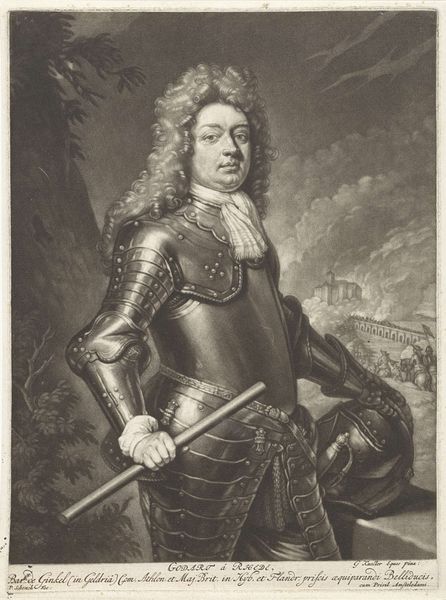 Curator: Let’s discuss Pieter Schenk's portrait, “Portret van Johannes Laemmell,” created sometime between 1670 and 1713. It is currently housed here at the Rijksmuseum. Editor: The weight of history sits heavily on this piece; just look at that armor! Its cool metal seems to absorb light. It also stands out as this portrait is rendered as an engraving, emphasizing line and texture. Curator: Indeed. The armor symbolizes status and authority, connecting Laemmell to a tradition of military or political leadership, a very common trope in Baroque portraiture. It also has all that intricate lace that frames the face with all its connotations of aristocratic affluence and privilege. Editor: I'm fascinated by that choice of engraving, the way that cross-hatching simulates the gleam of metal and the texture of that lace ruff. What social context produced a demand for meticulously engraved portraits like this? How much time was involved and what did it cost? I mean this has to do with the technologies used to disseminate the portrait on a wider basis, right? Curator: Exactly. This image would have been relatively easy to reproduce to spread this portrait among different spheres. By rendering him in armor, the engraver has deliberately associated Laemmell with classical virtue and strength, turning his portrait into a broader statement about leadership and character. Editor: It makes me wonder about the function of art then, too. Was the image's accessibility designed to enhance the sitter’s authority by depicting them within such historical visual regimes? Or was its production an attempt at an early model of "branding"? Curator: It suggests the power of representation at the time; and how symbols were intertwined with a very deliberate attempt to elevate the status of individuals. Editor: Agreed, this portrait engraving gives us a glimpse into the networks of labor, technology and aristocratic life. I'm so fascinated by these echoes we get in these older pieces.