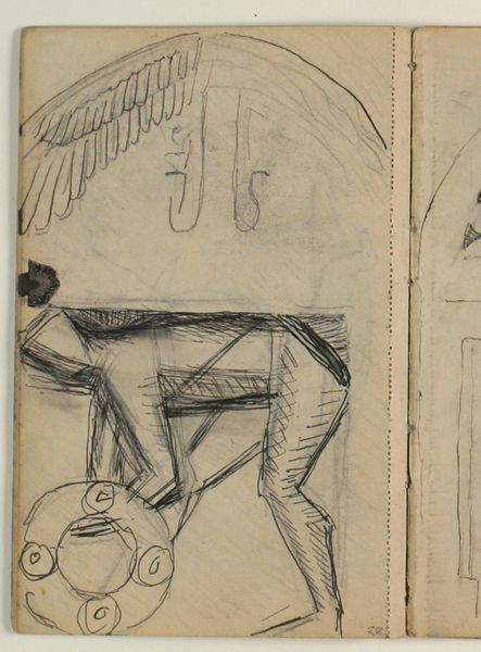 Curator: We're now viewing a preliminary sketch, dating from 1937-38, by Niels Larsen Stevns titled, "Udkast til 'Kristus helbreder en spedalsk.'" It's rendered in pencil on paper and resides here at the SMK. Editor: The immediacy of the sketch jumps out—so many active lines implying motion and texture, even though it's predominantly light. I get a palpable sense of yearning from this work. Curator: Indeed. Even in this nascent stage, Stevns captures the essence of compassion central to the biblical narrative of Christ healing the leper. The symbols may be sparse but they are loaded: the touching of hands which implies a passing of purity or divinity... Editor: I’m fascinated by how the composition leads our eye. From left to right we see the palm or some botanical form on one page and Christ figure on the other. Do you feel that is symbolic in some way? The botanical could also point to the idea of healing or a remedy for disease. Curator: It is also possible to think about a specific moment from the story: Christ touched the man afflicted with leprosy. That contact was the physical manifestation of Christ's compassion and power, overriding ritual and cultural boundaries. It represents empathy extended to those stigmatized and ostracized from communities then and sometimes, today. Editor: A lot of what moves me comes back to line. Consider the architectural details hinted at behind the figure of Christ. The strong verticals lend the composition stability and give him additional presence. Even as a preparatory sketch, the materiality has incredible intention. Curator: Such stark contrast emphasizes the dramatic significance of this moment and gives you chills. The power lies not just in representation but in symbolic communication. It offers a visceral understanding beyond language. Editor: Absolutely, and appreciating Stevns' use of form allows a deeper grasp of that power, echoing through art history, influencing its own narrative thread, and reaching viewers anew today. It makes you wonder about the full size of the rendering for such an intricate, loaded set of decisions.