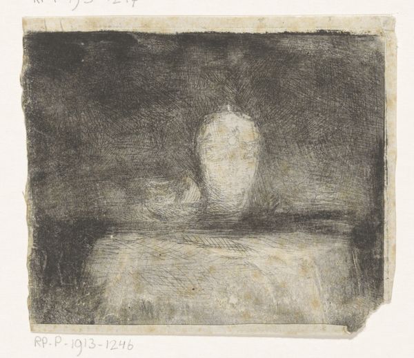 Curator: We are looking at Paul-Albert Besnard's "Leda Sleeping," an etching dating back to 1913. Editor: My initial impression is one of disquiet. The tangled lines create a sense of unease, of something lurking just beneath the surface of the composition. Curator: The dense cross-hatching certainly contributes to that feeling. It almost obscures the figures of Leda and the swan, blending them into a single, textured form. The lack of clean lines and distinct forms moves beyond pure representation, invoking a symbolic dimension. Editor: Absolutely. Considering the myth of Leda and the Swan, that sense of obfuscation feels pointed. It mirrors the violence inherent in the narrative, a kind of visual violation made all the more unsettling by its hazy depiction. There is nothing romantic here; it's all dark encounter. Curator: Precisely. The artist utilizes a limited tonal range, mostly darks, to express an intensity. Note how the swirling lines create movement, emphasizing the dramatic tension between the figures. The absence of detail invites multiple interpretations of the act itself, allowing the viewer to contemplate on themes of power and desire. Editor: Yes, and look how the swan's form seems to dominate Leda. The work invites us to grapple with the intersection of myth, power, and the female body within historical art narratives, prompting critical analysis rather than passive observation. The composition seems to question what is being concealed, inviting us to probe uncomfortable aspects within art history. Curator: A thought-provoking print from Besnard; its formal qualities invite deep analysis of his mark-making, revealing a visual story with layered meaning. Editor: An uncomfortable but important contribution that unearths an aesthetic experience from a well known myth and invites deeper conversation.