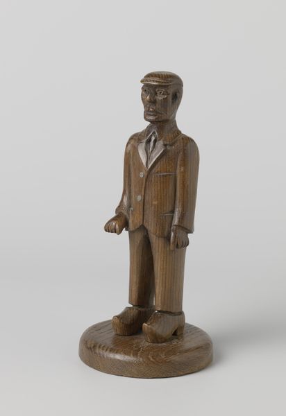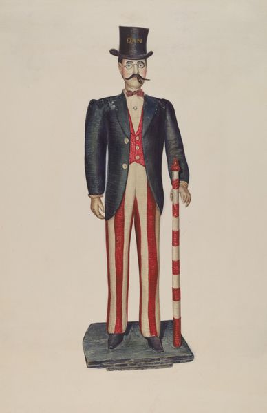 Editor: This is "Carved Figure (Possibly a Tailor's Shop Sign)" from around 1937 by Frank McEntee, made of wood. The figure's stance is so stiff, it almost feels like a caricature, but with an element of suppressed sadness. What’s your interpretation of this work? Curator: It’s intriguing, isn’t it? This piece invites us to consider the intersections of labor, representation, and social identity in the pre-war era. The figure's rigid posture, coupled with the assumed profession, reflects a certain class consciousness, I think. He's "dressed up" but there's no movement or flexibility; it’s all surface, all display. How does this reading resonate with your initial impression? Editor: That’s fascinating. I was focused on the individual's expression, but viewing it as a commentary on class changes my perception. The almost cartoonish portrayal could be interpreted as a subtle critique of the tailor’s aspirations, trapped, maybe, by societal constraints? Curator: Exactly! And consider this: How does the commercial purpose of this object - possibly a shop sign - impact its artistic value? What does it say about the boundaries between 'high' and 'low' art? Perhaps this ‘craft object’ attempts to mimic and challenge ‘high’ portraiture? Editor: That’s a great question, I never would have thought of this portrait that way, considering artistic value in this social and economical context, that's enriching. Curator: Agreed, by situating it within historical power structures, we unveil not just the artist’s intention, but the cultural anxieties of the period. Editor: It is an interesting dialogue about the nuances that form art creation, purpose, and audience.