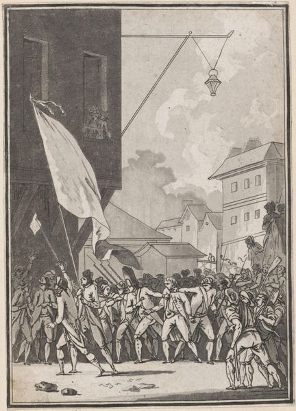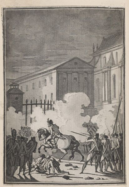 Curator: Janinet’s small etching depicts a scene from the storming of the Bastille: "The Marquis de Pellepont, Wanting to Wrest the Major of the Bastille from the Hands of the People, Is Himself Close to Being Killed by the Hatchet Blows of a Relentless Man (14 July 1789)." Editor: The raw energy is palpable. The frenzied crowd, the relentless motion—the image captures the moment of upheaval with startling immediacy. Curator: Indeed, Janinet presents a pivotal historical moment, emphasizing the social dynamics at play. Notice how the architectural backdrop contrasts with the chaotic violence—the seat of power against the force of revolution. Editor: And look at the varied weaponry—the makeshift tools transformed into instruments of rebellion. The means of production, typically controlled, are now wielded by the people. It speaks volumes about access to power. Curator: Absolutely, and this print, as a relatively accessible medium, also played a role in disseminating revolutionary ideals. The imagery itself became a tool. Editor: Ultimately, this isn't just a historical document, it's a reflection on the material circumstances that ignite societal change, and it is amazing how Janinet captured it. Curator: A compelling point. This piece, in its creation and content, embodies the turbulence of the era, and the power that images hold in shaping public perception.