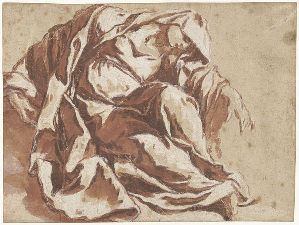 Editor: Here we have Sigismondo Caula's "Two Seated Bearded Male Figures," dating roughly from 1637 to 1713. It's a charcoal drawing with such a striking, almost melancholic mood. What do you see in this piece, especially regarding its imagery? Curator: I'm drawn to the visual language of the drapery. The way the hooded figure almost recedes into shadow evokes a sense of sorrow or contemplation. Think of the tradition of depicting figures in mourning throughout art history, consider how the veil or shroud operates as both concealment and revelation. Do you see any echoes of similar imagery here? Editor: I do. The shrouded figure reminds me of depictions of grief or even religious penitence. The older figure is more exposed but not necessarily in a positive way – the way he sits makes him seem pensive. Is there any religious element, maybe, in how they are rendered? Curator: Possibly. The placement of the figures could reference many narratives: teacher and disciple, or even an Old Testament prophet. Notice how the light falls – selectively illuminating the textured face of the exposed figure and contrasting so starkly with the obscuring fabric around the other figure. This duality carries weight; it speaks of the interplay between knowledge and concealment, revelation and mystery. Do you get a sense of dialogue – a symbolic discourse occurring between these two figures, visually represented? Editor: Yes, I see it now. One illuminated by wisdom, the other cloaked in it... or hidden from it. Thanks. I learned so much. Curator: Indeed! Symbolism gives old paintings renewed relevance in each passing era, shaping their reception and creating dynamic cultural memory.
