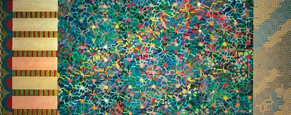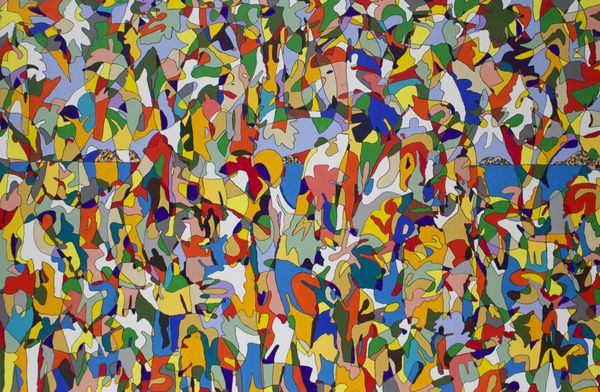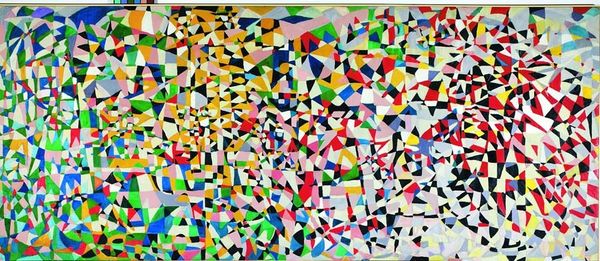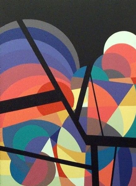 Curator: My eye is immediately drawn to the composition’s vibrant energy, the riot of colour is exhilarating. Editor: Indeed, it’s quite dazzling. What we have here is an untitled mixed media piece by Princess Fahrelnissa Zeid. There’s no date attributed to the artwork but it’s definitely an intriguing work, playing with abstraction, bold colours, and what looks like a structured, yet chaotic geometric style. Curator: Mixed media…I’m keen to know about her specific application. What kinds of paints or dyes did she use, and what was the effect she was after? The layering seems key. Also, thinking about the conditions she was creating under–the accessibility of different materials, her studio set up – that surely informed the overall composition we see here. Editor: I find myself contemplating its reception during the height of modernism. Geometric abstraction offered a visual language seemingly free from the weight of history, but was it really? Did its display in specific gallery spaces, framed by particular critical discourses, truly liberate it from socio-political baggage? Curator: These colours – the blues, reds, yellows, purples – they almost feel playful, and somewhat synthetic too. It almost seems like something almost mass produced, even though it looks so handmade. What do you think its worth is? What sort of social class consumed Zeid's artwork at this time? Editor: What a fascinating tension – the allure of the geometric, a utopian impulse clashing with the undeniable mark of the artist’s hand and also how it can also reflect the increasing globalisation of art market forces within post-war cultural exchange. Museums themselves were shifting, becoming crucial actors in constructing the narratives around artists and their creations. The display itself becomes a kind of contextual material to study. Curator: Well, I feel like my interest is piqued, particularly concerning the materiality and labor involved in creating these kinds of abstract shapes and considering Zeid's intentions within this socio-economic, material-based and labour dynamic. Editor: Absolutely. The complex layers of influence make appreciating it so much richer; these abstract lines really create a cultural puzzle of that time and context.