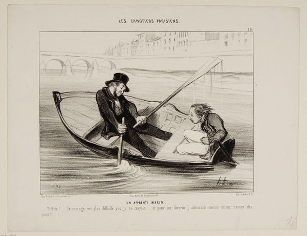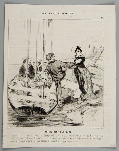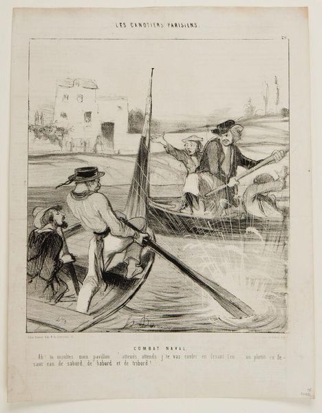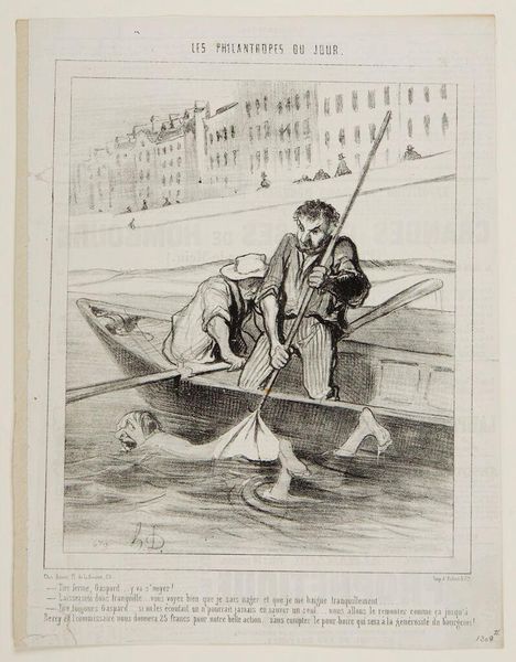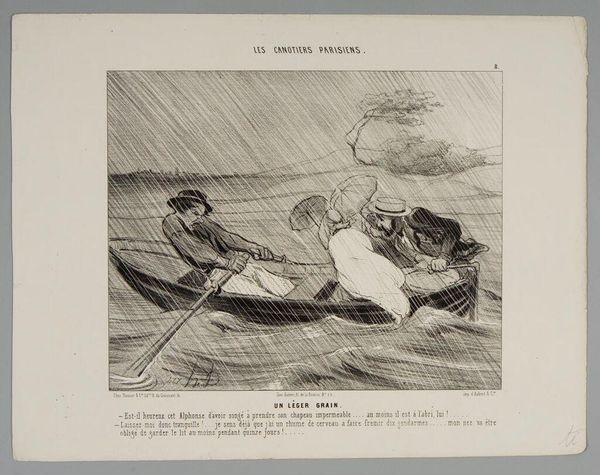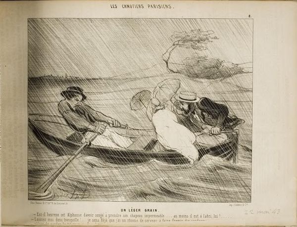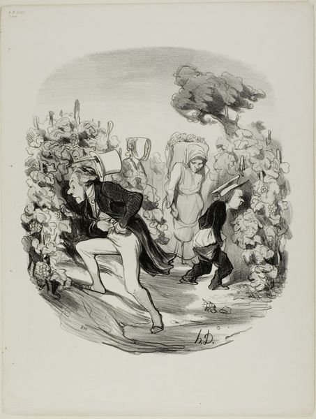 Curator: Here we have Honoré Daumier's lithograph, "The Gust of Wind." Editor: Woah, the frantic energy practically leaps off the page! It's like a visual scream, all swirling lines and desperate gestures. Curator: Daumier was a master of capturing social satire, and this piece is a perfect example. The hat symbolizes status and the perils of vanity being swept away. Editor: Absolutely! The wind becomes this great equalizer, stripping away pretense with a single, forceful gust. I see a deeper connection; the ephemeral nature of existence, perhaps? Curator: Indeed, the wind acts as a reminder of life's fleeting moments. It's quite a profound image, isn't it? Editor: It is. It really makes you wonder what storms are brewing just beneath the surface of our own lives.