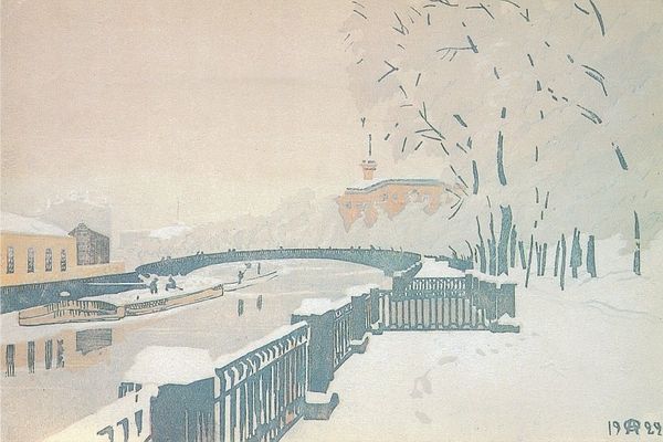 Editor: This is Unichi Hiratsuka's "Akasaka Diet Library." It's a lovely woodblock print. The scene feels so serene, almost hushed. What do you see in this piece, beyond the surface? Curator: I see a dialogue between tradition and modernity. Hiratsuka, working in a period of intense socio-political change in Japan, utilizes traditional printmaking to depict a modern institution. Consider the library as a symbol of knowledge, power, and potentially, control. Editor: Control? How so? Curator: Well, who has access to this knowledge? Who shapes the narratives within? Hiratsuka's choice of medium, an art form often associated with folk art and accessibility, juxtaposed with the imposing architecture of the Diet Library, raises questions about power dynamics and the dissemination of information. What do you make of the composition? Editor: I hadn't considered that. The starkness and perspective create a sense of distance and formality. I see it now. Thanks. Curator: And that's exactly the point: to see beyond the aesthetic and understand the work as a product and reflection of its time.