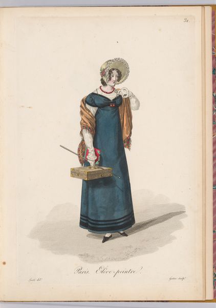 Francisco Fierro created this watercolor drawing of a monk from the order of Barbones, likely in the mid-19th century. The composition is simple: a figure stands in profile against a pale, unmarked ground. The near-monochromatic palette, dominated by blacks and grays, lends a certain austerity. Consider how Fierro utilizes line and shape to define the monk’s habit. The broad-brimmed hat and flowing cloak create strong horizontal and vertical lines, respectively. This structured arrangement reflects the rigid social hierarchies of colonial Peruvian society, where religious orders held significant power. The monk's attire, a visual signifier of his status, becomes a focal point through Fierro's careful rendering. The very act of depicting such a figure raises questions about representation and cultural identity. Fierro seems to present more than just an individual; he offers us a study in semiotics. Here, dress functions as a coded message about the place of religion in Peruvian life. What do you think?