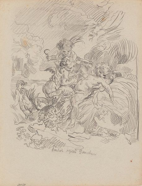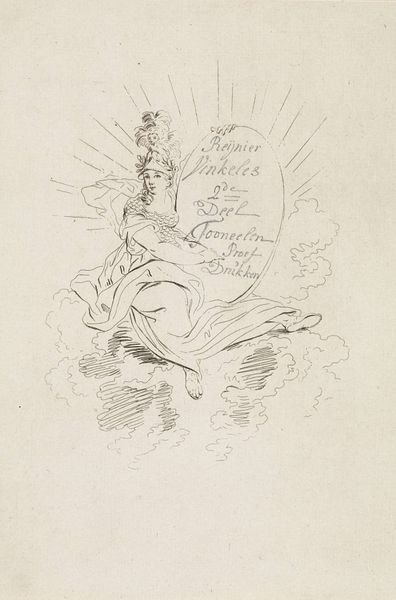 Hermanus Fock created this drawing, "Minerva met ganzepen," using pen and gray ink, sometime before 1822. Notice how the artist utilizes delicate lines and tonal variations to depict Minerva, the Roman goddess of wisdom and strategic warfare, floating on clouds while holding a blank oval shield. The ethereal quality is enhanced by the radiating lines that emanate from behind Minerva, creating a divine aura. The composition is structured by the contrast between the detailed rendering of the goddess and the open space of the shield. The shield functions as a signifier, inviting viewers to project their interpretations and understandings of wisdom and power onto it. The blankness challenges the conventional representation of Minerva, prompting a re-evaluation of her attributes. It destabilizes fixed meanings and engages with new ways of thinking about representation. The formal qualities of line and space prompt us to consider how artistic representation can function as a site of ongoing interpretation, where meaning is not fixed but actively constructed through engagement.