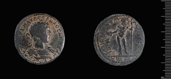 Editor: This is a coin of Constans, with no precise date available. Given its age and wear, what elements of its form and composition stand out to you? Curator: The coin's circular form immediately suggests wholeness, power, and continuity. Notice how the incised portrait and figures adhere to the coin's edge, creating a sense of containment and controlled space. Editor: That's interesting. So you see a relationship between the shape and the imagery? Curator: Precisely. The medium itself—the metal, the circular shape—functions as a signifier of imperial authority. The very act of minting and circulating these objects reinforces the ruler's power. Editor: I see what you mean. It’s fascinating how the form and the image work together to convey authority. Curator: Indeed. It prompts us to consider the semiotics of coinage, as the images become powerful symbols through their intrinsic visual design.