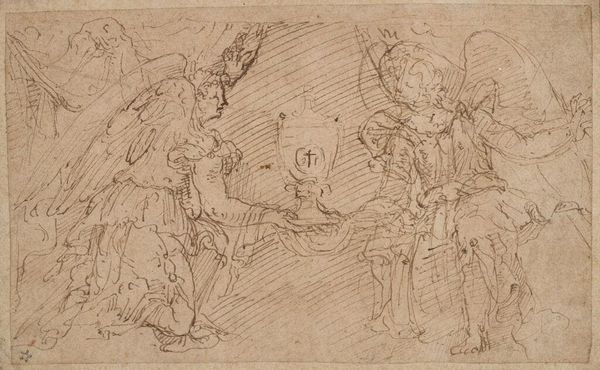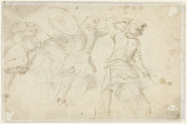 Curator: Here we have "Carnival Figures", an undated drawing by Baccio del Bianco, rendered in chalk on paper. It resides here at The Art Institute of Chicago. Editor: Oh, immediately the sense of movement and, I don’t know, controlled chaos just leaps out. It's like a bizarre, elegant parade of… are those demons? And then that dandy at the end… intriguing. Curator: Indeed. Bianco, a Renaissance artist of Italian descent, captures what we interpret as carnival participants in a highly dynamic composition. Observe the variety in their gestures and costuming. Editor: Right! I am just curious what they're so excited about. Look at the third character in the image – he has this spiky, sun-like ball on a pole... he is definitely celebrating. What do you think it is symbolizing? A victory? A parade gone rogue? Curator: These kinds of portrayals reflect an era when social structures permitted expressions of parody. Think about carnival celebrations as temporary inversions of power structures – a moment when commoners might mock royalty. The visual codes in Bianco's work would then play into established tropes within carnival culture. Editor: So the drawing captures not just figures but a moment of societal release. I love how seemingly spontaneous the strokes feel; you get a real sense of these figures bursting with character, don't you think? You know what else strikes me? There’s almost a theatrical quality here. A stage come to life, where all norms get turned on their head. Curator: Precisely! The theatre held a significant cultural role, offering public space for social commentary. Artists actively engaged with the political commentary in carnival rituals. Their artwork became visual recordings of traditions, which we may now research, study, and interpret, centuries later. Editor: I'm truly struck by how the artwork acts like a portal— it gives us glimpses into the joys and subtle rebellions embedded in Renaissance society. Looking closer I notice Bianco paid great attention to body shapes. There are small characters and "buff" ones! I find them really funny and love how they show so much character through their pose. Curator: It highlights art's critical public function and how artistic portrayals influenced not only perception, but also preserved cultural understanding across generations. Editor: Exactly. It makes you realize how looking at art is really just having a very animated and intriguing chat across time. It has been real to get another person's POV! Curator: Absolutely, another enriching insight into history through art, reminding us that our view of society will continue to shape culture through every step of art.