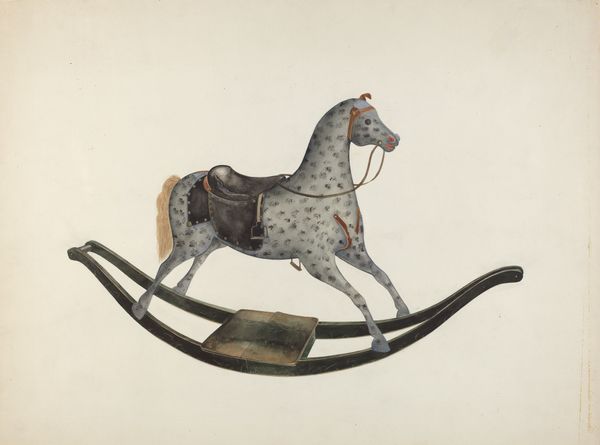 Curator: This is a watercolor and mixed-media drawing of a horse weather vane, created anonymously between 1935 and 1942. Editor: My first thought? It's spectral somehow. Like a ghost galloping across a faded sky, carrying secrets of farms long past. The patina, though painted, reads as genuinely aged. Curator: I agree about the spectral quality. Consider the interplay of line and wash. The artist captured the metallic sheen of the weathervane while implying movement through the horse’s posture. There is tension between static representation and dynamic suggestion. Editor: It's the simplicity that grabs me. Minimal lines, almost childlike in their directness. Yet, within those lines, a whole world unfolds. Wind, weather, the endless turning of seasons on the land… Curator: It’s intriguing to imagine why the artist chose this subject. A weather vane, traditionally a functional object, transformed into art. Is it a celebration of rural life, an exploration of form, or something more abstract? Editor: Maybe it’s all those things. My eye keeps being drawn to the coloration. What materials do you think create that blue-green, coppery tone? It feels so evocative. Like oxidized bronze dreaming in color... or perhaps longing for green grass after gazing upon brown earth for long. Curator: Likely a combination of watercolor washes and colored pencil to build depth and simulate the verdigris often seen on aged copper. Note how it is used to create shading, highlighting key features to lend a three-dimensional feel despite existing on a flat surface. Editor: Knowing the drawing dates to the late '30s-early '40s also layers into my experience. It suggests a perspective – an eye watching over the landscape during very uncertain times. There's something inherently resilient symbolized here, both practically and aesthetically... A constant watchfulness, ever adaptive like an active consciousness upon a windswept rooftop Curator: That adds a powerful dimension. Considering the period and anonymous creator, we must consider various economic and social factors too in approaching how we view artwork Editor: So, for me, this unassuming piece becomes so much more than the illustration of an object; it is a gentle reminder, almost, that some truths and realities persist regardless. And the best thing about that notion, when approaching the reality in our current times, this can actually fill you with inspiration when needed the most.