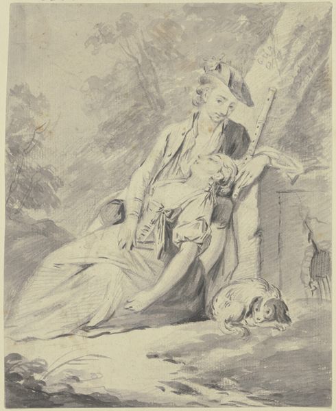 Editor: So, this is *Lady in a Garden*, an 18th-century piece residing here at the Met, believed to be an anonymous work. It looks like a print, perhaps with watercolor, depicting, well, a lady in a garden! It's really dreamlike. I am particularly drawn to the colours. It gives a melancholic air with some sweetness. What are your initial impressions? Curator: "Melancholic sweetness," you say? I love that! It strikes me as a fleeting moment captured, like a memory half-faded, half-cherished. Notice how the soft lines and colours don’t give you every detail? It's Rococo flirtation, a pastoral fantasy! What does the angel's presence suggest to you? It feels so staged, yet somehow honest. It invites the viewer in, doesn't it? Editor: It does, now that you mention it. I suppose I saw the angel as part of the scenery almost – classical sculpture as garden decor! But perhaps its presence adds a layer of symbolism? Curator: Exactly! It's about artifice and sentimentality, all wrapped up in a pretty pastel bow. Think about what it meant to pose *à la grecque*, in a landscape, back then – what kind of identity it suggests. The way she is casually engaging with this putto speaks of a playful approach to sentimental themes! Perhaps it’s satire, or a genuine immersion? What do you feel, deep down? Editor: That tension is really interesting – whether it's genuinely felt, or a commentary. It's less straightforward than I initially thought. Thanks! Curator: And that’s where the fun begins! Art whispering, not shouting. Now, go find a garden yourself!