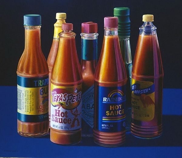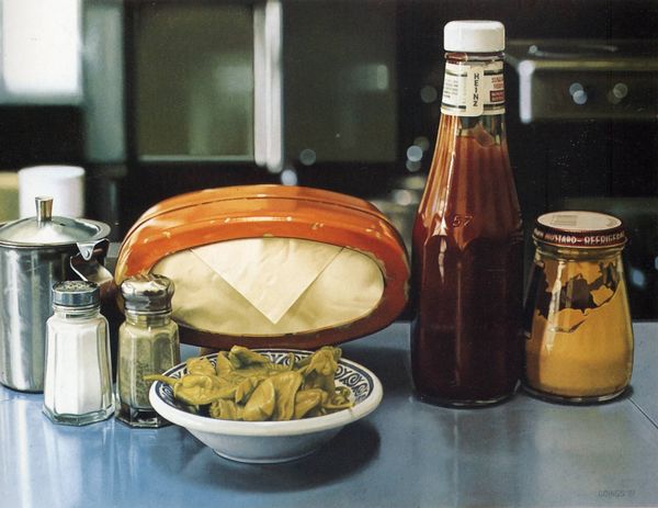 Ralph Goings made this photorealist painting, Sauces, which depicts everyday condiments. Goings was part of a movement of artists in the late 1960s and 70s who turned to photography as a source for their paintings, often capturing the banal objects of consumer culture. Sauces reflects Goings' fascination with the play of light on surfaces and the way ordinary objects reveal the social fabric of American life. The condiment bottles suggest a cultural landscape shaped by industrialization, mass production, and consumerism. We may think about the labor involved in producing these goods, who has access to them, and how they shape our experiences around the dining table. The sauces evoke a sense of nostalgia, conjuring up images of diners and family meals, as well as more critical questions about what and how we consume. Goings encourages us to find beauty and significance in the everyday, sparking reflection on the cultural and economic systems that shape our lives.