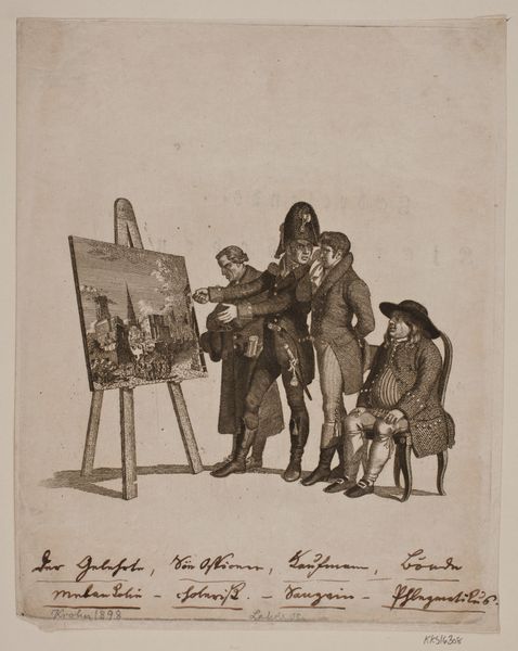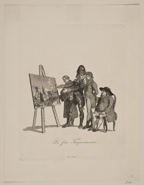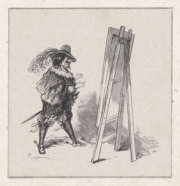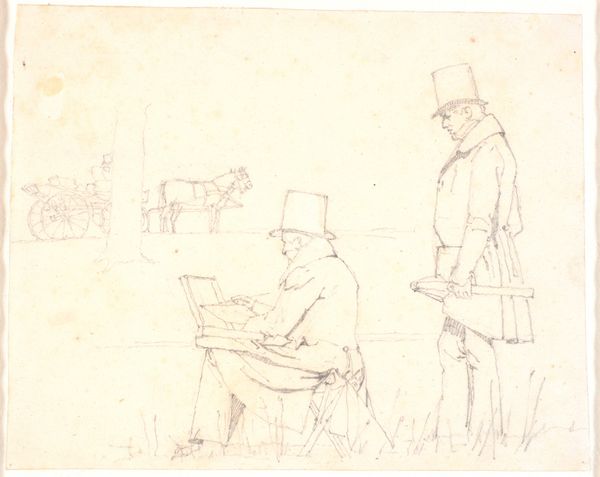 Curator: What strikes me first about this 1865 pencil drawing by Louis Apol, titled "Portret van Johannes Franciscus Hoppenbrouwers voor zijn ezel en A. van den Berg toekijkend," is its palpable sense of artistic self-awareness. It depicts the artistic process itself. Editor: Yes, and there's a subtle drama—almost a comedic one—in the contrast of the artist absorbed in his work and the upright figure observing, perhaps judging. It evokes the dynamic between creator and critic, doesn’t it? A powerful and recognizable dynamic in the creative sphere, still present today. Curator: Indeed. Consider how Apol meticulously renders the easel, the palette, the artist's focused posture—everything essential to the act of painting. There's a real emphasis on structure and form here. The use of line and value creates a structured hierarchy, guiding the eye. Editor: Beyond the purely formal, though, there's a narrative. Hoppenbrouwers, the painter, confronts not just the canvas, but also the symbolic gaze of Van den Berg, perhaps representing societal expectations or the judgement of artistic peers. The painting within the drawing, so to speak, creates an introspective feel. Curator: Good point. But if we focus purely on its structural qualities, the piece relies on implied lines to draw connections between the three central subjects of the painting: the easel, Hoppenbrouwers, and Van den Berg. This lends balance and stability, don't you think? The work, for me, gains power and intrigue from the masterful, underlying architecture present within it. Editor: I agree, yet those muted tones, for me, invoke a melancholic feel, speaking of art’s constant grappling with transience, the fading of time, the pressures of onlookers. It invites viewers to recognize and remember similar power dynamics they may have encountered. A commentary, perhaps, on the artist's solitary struggles amidst public scrutiny. Curator: It is a delicate dance of intention and interpretation. Considering the way you explore deeper meaning in art is always fascinating, as is the process by which we evaluate formal choices in artwork. Editor: Yes, seeing your analytical framework for appreciating art has made me think differently about this piece—thank you for helping me explore more depth and structure.