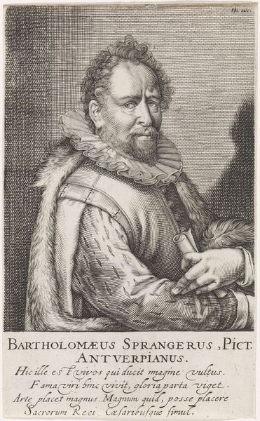 Editor: This engraving, "Sebastiaan Vrancx," made between 1630 and 1645 by Schelte Adamsz. Bolswert, strikes me as a study in power. The subject's gaze, the way he holds that sword... What do you see in this piece? Curator: It's more than just power, I think. Consider the historical context: Vrancx was a painter of battles. This portrait, created in the Dutch Golden Age, presents a specific type of masculinity – one tied to civic duty and military prowess but also artistry. Bolswert's choice to depict Vrancx with such detail also highlights the sitter’s identity, positioning him within a nexus of artistic, social and political concerns. Who held the power to commission portraits like this? Editor: So it speaks to a hierarchy of status. Does his stern expression suggest something beyond confidence, maybe a burden? Curator: Absolutely. Think about the Netherlands at this time, constantly navigating political and religious turmoil. Vrancx, as a painter of battles, visualised these struggles, maybe even participated in them. This image then becomes a reflection on the costs of conflict and leadership. We should ask: who benefits from this representation of power, and whose stories are left untold? Editor: That’s a great point. I was focusing solely on the individual, but placing it within that wider societal conflict and hierarchy changes my understanding. Thanks! Curator: Precisely. Examining these works necessitates an intersectional lens, enabling us to comprehend the intertwined aspects of identity formation.