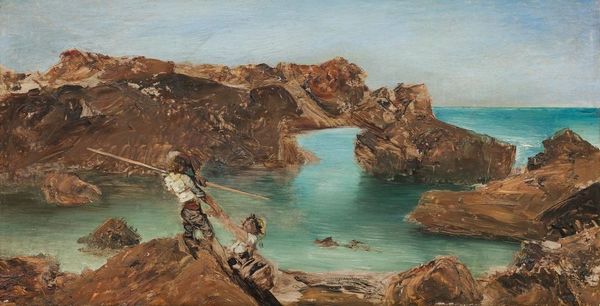 Editor: This is Luc-Olivier Merson's "Hermit in Seaside," an oil painting depicting a figure seated on a beach. It strikes me as a very enclosed, almost claustrophobic composition, despite being a seaside scene. What do you see in this piece, especially concerning its structure? Curator: Indeed, the sensation of enclosure stems from Merson’s strategic manipulation of form. Notice how the towering rocks on either side act as visual parentheses, tightly framing the composition and directing the viewer's eye inward. Observe also the diagonal thrust of the rock formations leading towards the centre, contrasted by the scattering of birds which seem to find a path away. How might we describe the color choices made by Merson? Editor: There is a dominating muted, earth-tone palette which only further intensifies the heavy atmosphere within this rocky enclave. How does the materiality of oil paint play a role? Curator: The impasto technique, particularly evident in the rendering of the rocks, creates a tangible texture that enhances the painting’s three-dimensionality. The rough, uneven surface mimics the ruggedness of the landscape, lending a tactile quality to the visual experience. Furthermore, the blending of pigments in areas like the sand evokes a feeling of shifting, unstable ground. Editor: I didn't notice those tactile aspects before! I focused so much on the hermit and the birds, missing the textural qualities of the environment itself. Curator: It’s precisely these subtle manipulations of form, color, and materiality that elevate the work beyond a mere representational depiction, allowing us to analyse its inherent qualities more distinctly. What seemed like just a beach is actually an interesting example of artistic vision!