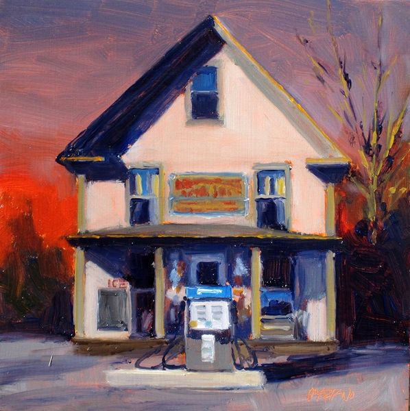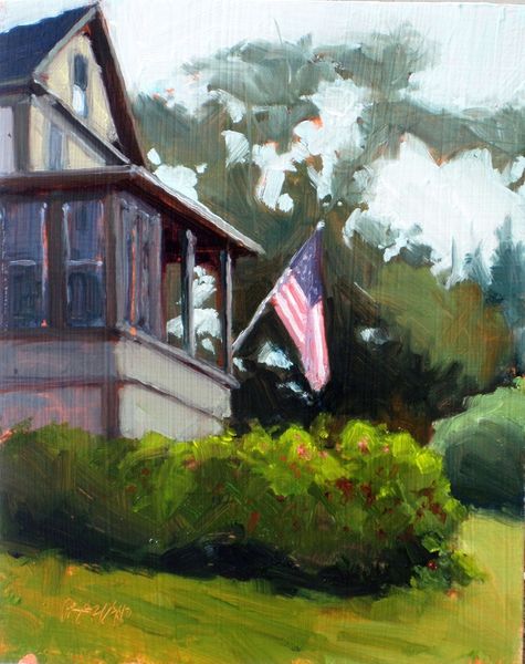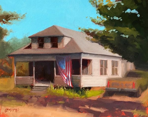Dan Graziano’s painting, ‘Summer Home’, presents us with a harmonious interplay of form and color, evoking a sense of nostalgic tranquility. The vertical composition, dominated by a two-story house, immediately draws the eye upwards, while the brushstrokes, thick and visible, animate the scene with a gentle vitality. Graziano uses a muted palette, with blues and greens, to bathe the house in a serene, almost dreamlike light. This use of color, combined with the soft edges of the forms, creates a sense of stillness. Yet, this calm belies a more complex interplay of structural elements. The house itself, rendered in geometric planes, suggests a deconstruction of traditional representation. The artist’s structural and semiotic approach challenges fixed meanings, inviting us to reconsider our perceptions of space and home. The American flag hanging on the porch introduces a layer of cultural coding. Ultimately, 'Summer Home' functions not merely as a visual representation but as a symbolic space, inviting ongoing interpretation and reflection.