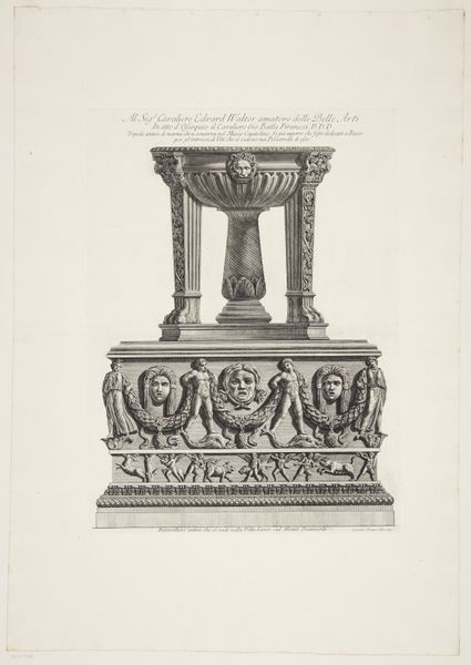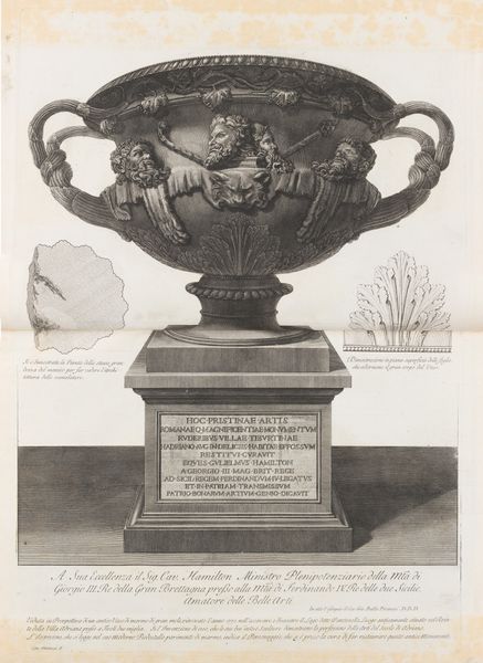 Editor: So, here we have Giovanni Battista Piranesi’s “Another View of the Warwick Vase,” dating from 1770 to 1778. It’s an etching and engraving, giving it this incredibly detailed, almost archaeological feel. What strikes me is the overwhelming ornamentation—it feels almost defiant. What do you see in this piece? Curator: The "defiance" you're picking up on is precisely where I want to begin. Neoclassicism, to which this print gestures, was in part a reaction *against* the excesses of the preceding Rococo. But look closer: Piranesi, while ostensibly documenting the vase, seems to be celebrating its elaborate, almost overwhelming details. What does it mean to meticulously record, even amplify, the ornamentation of an object associated with empire, at a moment when ideas about national identity were being hotly contested? Editor: That’s a great point. It’s like he’s not just showing the vase, but also the power and historical weight it carries. I wonder, then, about his intention – was he endorsing that power, or perhaps critiquing it by exaggerating its symbols? Curator: Exactly! The question becomes: Is Piranesi glorifying the grandeur of classical antiquity, or subtly exposing the ways in which empires use aesthetic forms to legitimize their power? Consider that this vase itself was a symbol of British aristocratic taste and collecting. By focusing on *another* view, as the title suggests, is Piranesi perhaps offering a counter-narrative? Does this ‘other’ view offer us a view from the margins? Editor: I hadn't considered that possibility, it does open up the idea that he's providing space for questioning rather than purely celebrating. Thanks, that's a perspective I’ll definitely be taking with me. Curator: And it reminds us that even seemingly straightforward depictions can be sites of complex cultural negotiation. A new viewpoint might show the underside and maybe destabilise old orthodoxies.