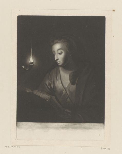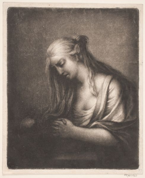 Pieter Schenk created this print of a sleeping girl by candlelight sometime between 1670 and 1711. The medium here is mezzotint, a printmaking technique that relies on the manipulation of a copper plate. The process starts by roughening the entire surface with a tool called a rocker, creating countless tiny burrs that would print as solid black. The artist then smooths or burnishes areas to varying degrees, creating lighter tones. This print is a tour-de-force, showcasing mezzotint's ability to render subtle gradations of light and shadow. Look closely and you'll notice the textures of the girl’s skin, hair, and clothing, all achieved through this meticulous process. Mezzotint was prized for its capacity to mimic the tonal range of paintings, making it a popular method for reproducing portraits and other images. As such, it sits at the intersection of craft, art, and commerce, a reminder that even seemingly straightforward images are the product of skilled labor and material transformation.