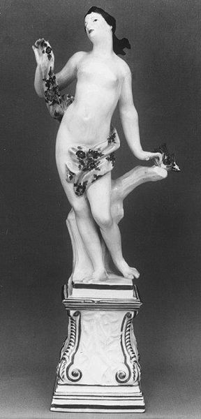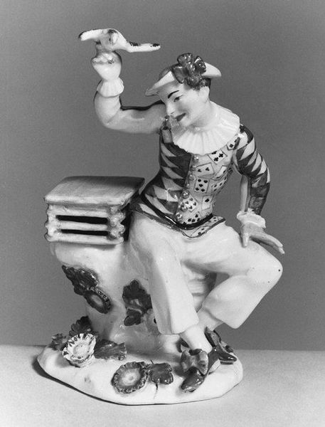 Curator: Here we have "Scaramouche," a porcelain sculpture made at the Höchst Manufactory between 1747 and 1757. Editor: He strikes a rather melancholic pose, doesn't he? A slender figure perched on what appears to be a decorative pedestal, frozen mid-dance. There's a certain theatricality to it all, despite the monochrome palette. Curator: Absolutely. The figure embodies Scaramouche, a stock character from the commedia dell'arte tradition. His black mask, cape, and the prop—likely a love letter—are all visual cues. These recurring archetypes would have been instantly recognizable, embodying wit, trickery, and often unrequited love. Editor: I’m struck by the object itself. Porcelain production was intensely secretive, incredibly expensive at this time, a real luxury. That it's been molded into this flamboyant form suggests a specific type of elite consumer. What does Scaramouche *mean* here, when filtered through the lens of craft and consumption? Curator: A potent question! Perhaps Scaramouche offered a form of escapism, a safe way to engage with irreverence and satire. Remember, porcelain itself was associated with delicacy and refinement, mirroring aristocratic ideals. So the character could become an emblem of both cultural aspiration and playful rebellion. Editor: Thinking about the labor needed to create the sculpture also shapes how I interpret it. This wasn’t some quickly sketched drawing but carefully molded and painted porcelain. There were whole systems dedicated to this level of production, dividing labor, securing resources. This figure embodies a world of making as much as dramatic expression. Curator: I see that materiality adds an extra layer. Scaramouche, through this medium, then represents the commodification of art and theatrical expression. The echoes of performances held across generations have been crystallized here in porcelain, offering us a material connection with bygone days. Editor: It definitely forces us to reconcile the ethereal realm of art and character with the very material realities of its making, selling, and circulation. Curator: Exactly! It is amazing how many complex threads of human expression are wrapped around it. Editor: A compelling figure brought to life, literally, through earth, fire, and skilled hands.