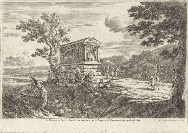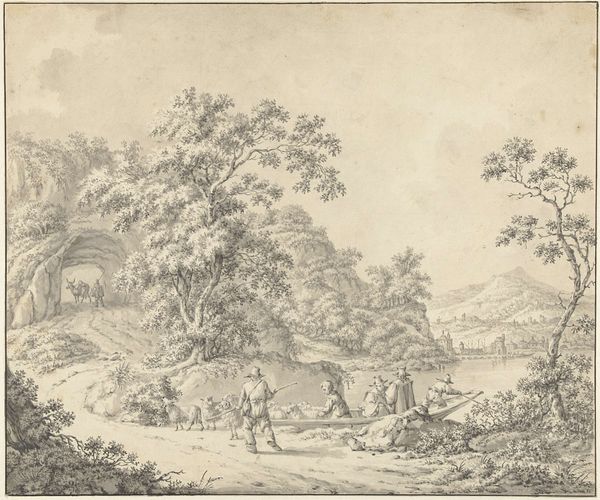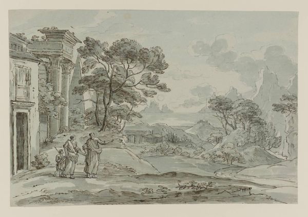 Curator: The Harvard Art Museums present this delicate drawing, "Travellers and Horsemen resting by a Fountain in an Italianate River Landscape," attributed to Dirk Maas. It captures a moment of respite in what appears to be a classical-inspired setting. Editor: My eye is immediately drawn to that central fountain—it's such a prominent, almost imposing structure amidst the natural landscape. The whole scene evokes a feeling of transient peace, a fleeting moment captured. Curator: Yes, and that fountain itself likely carries symbolic weight. Fountains have long represented life, purity, and even renewal across cultures. Here, it's a meeting point, a place of rest for those traversing the land. It invites us to consider how access to resources like water shapes social interactions and hierarchies. Editor: Precisely! Look at the figures gathered around it. The artist groups them in a way that suggests a hierarchy, with the well-dressed figures standing closer, while others are more on the margins, almost subservient. These groupings likely reflect the social dynamics of travel in the period. Curator: And the classical influence is undeniable. The fountain's design, the landscape's composition, it all echoes the ideals of the Italian Renaissance. This speaks to a broader cultural context of Europeans looking to classical antiquity for inspiration and legitimization. Editor: It's interesting how such a serene scene can reveal so much about social structures and cultural aspirations. Thank you! Curator: It really does invite you to consider both the surface beauty and the deeper historical currents.