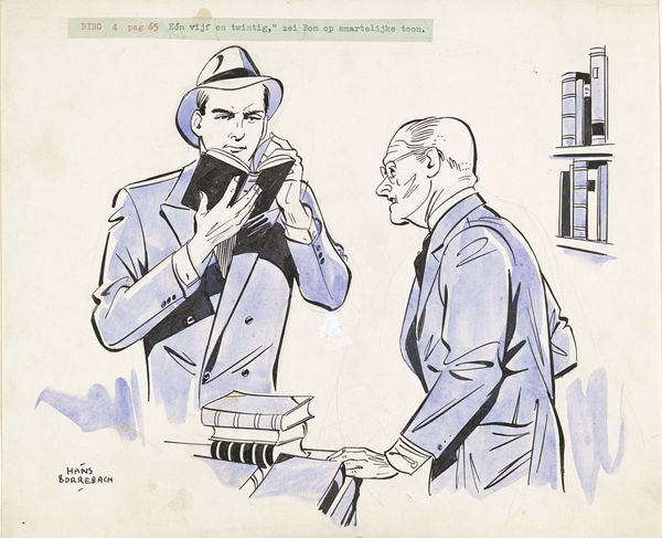 Curator: Look at this interesting pen drawing from Hans Borrebach, titled "Young Man Offers Lony a Bottle of Advocaat," dating from before 1954. It has such a light touch and open composition! Editor: It's a curious image, quite linear, almost an illustration… The color palette is extremely limited. What is the significance of the advocaat? Curator: Advocaat, a traditional Dutch alcoholic beverage made from eggs, sugar, and brandy, can signify celebration or indulgence, but it can also indicate domesticity and perhaps something darker going on within this "genre painting." Editor: Do you think so? To my eye, its almost comic style—those stark black outlines filled with monochrome blue—belies that. The pen drawing makes visible the artist's hand, prioritizing efficiency and reproducibility for widespread circulation. The means of making this points more to commercial art, an aesthetic decision which aligns more towards disposable printed matter than with more canonical mediums. Curator: That's an astute observation regarding its reproducible qualities! Borrebach also includes the easel behind the figures bearing the portrait in progress. We see the artist figure here engaged in making but also showing the "end product". We are invited into the studio space and an intellectual inquiry around artistic interpretation, social exchange, class... Editor: Perhaps there is indeed more lurking beneath the surface here than initially appears. I noticed, too, how the label on the advocaat bottle has been meticulously included. Brands and trade! Even that is carefully placed into the whole. Curator: I agree. We are both caught in this tension between the everyday—represented by both commodity and common exchange between people, even offering drinks—and an examination of cultural symbolism, of our shared, learned symbolic landscape that both tells about us and reflects who we have become through those symbols. Editor: So, it's a work about social dynamics made readily accessible through its stylistic choice and yet thought provoking through that added layer. Fascinating! Curator: Absolutely. The combination of symbolism and its visual aesthetic truly offers food for thought.