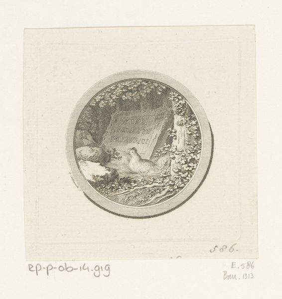 Curator: Welcome. Here we have an engraving from 1788 by Daniel Nikolaus Chodowiecki, titled "Young couple chased by an older man." It resides here at the Rijksmuseum. Editor: Well, it certainly captures a frantic energy, doesn't it? There's a sense of chaos—bodies tumbling, clothes askew—all framed within this neat, almost decorative circle. It strikes me as quite dark, even humorous. Curator: Absolutely. Considering the production, the artist likely used a burin to carve these intricate lines into a metal plate. Prints like this would have been relatively accessible, spreading narratives and social commentary to a wider audience beyond the elite. I’m curious about the socio-economic context of printing such narrative art for consumption. Editor: The symbols at play are interesting. Note the pursuit. What could that older man signify? Perhaps societal expectations or familial control looming over young love. Then there's the setting, perhaps an Eden-like space violated, judging by the disruptive nature of their actions within the fence, trees, and figures. It raises questions about individual freedoms. Curator: Good point, but look closely. See how Chodowiecki utilizes line weights? Notice the varying pressure creates depth and texture, particularly on the man's coat and on the face of the older man, heightening the emotional intensity and adding physicality. This work represents Chodowiecki's dedication to detail. The engraving also uses an old frame to attract customers that have particular taste. Editor: I agree. Yet I see that intensified detail in his face as a potential symbolic reference to time. His furrowed brow hints at worry, or maybe anger... his presence and its contrast to the blissful younger couple serves to make you wonder: what is the social status of all involved and what type of consequences will they all suffer after? The fall of the youngsters, what do we do with it? Curator: Perhaps we shouldn’t focus on status, but instead the practicality. These engravings weren't luxury items. The creation, the sale, the dissemination...it reflects broader social shifts and technological advances in that era that made it a practical piece. The use of readily available material must also be addressed. It has to be discussed for those interested in the engraving making techniques! Editor: An excellent perspective, indeed. What a multifaceted piece! Curator: Yes, definitely food for thought. The piece, the historical aspects...so much is covered.