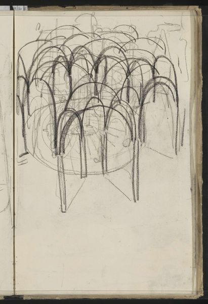 Carel Adolph Lion Cachet made this artwork, "Architectuurstudie," using graphite or charcoal on paper. The sketch is a fascinating study in lines and forms, evoking a sense of spatial ambiguity. Notice how the composition is divided into distinct geometric elements. At the top, a cluster of arched shapes floats above a circular form, which is supported by vertical lines. Below, a cube-like structure adds a grounded element, yet the overall effect is dreamlike and unanchored. The artist's use of line – sometimes tentative, sometimes bold – creates a dynamic tension. This interplay between geometric precision and ethereal suggestion invites contemplation on the nature of architectural space itself. The drawing prompts us to consider how Cachet destabilizes our conventional understanding of form and structure. Is he exploring the basic elements of architecture, or is he challenging the very notion of stability and order? This piece offers no easy answers, instead inviting us to ponder the shifting, fluid nature of space and form.