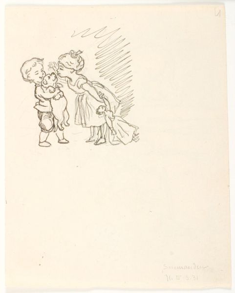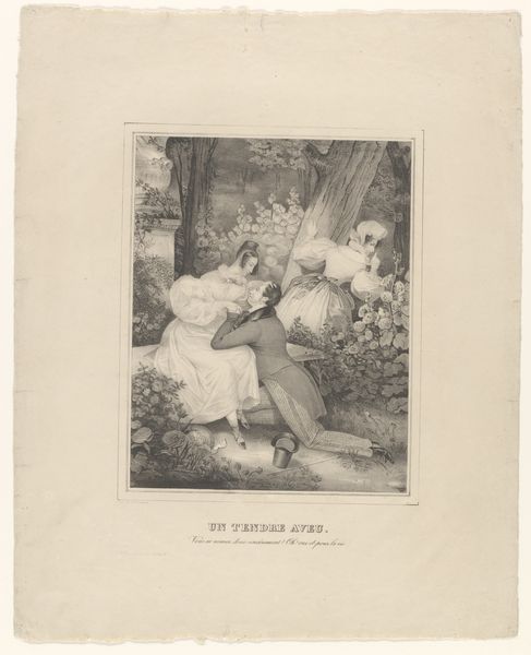Curator: Here we have Tony Johannot's etching, "Two Children with a Woman on a Bed," likely created sometime between 1813 and 1852. Editor: My initial impression is of soft intimacy, achieved with very fine, delicate lines. There’s a real sense of tenderness in how the figures are positioned. Curator: It is an intriguing domestic scene. The presence of mother and children, portrayed with delicate detail in the etching, presents an interesting perspective on familial roles of that era. How do you interpret the visual relationships created by these etched lines? Editor: Well, consider how the lines delineate form, particularly in the draping fabric and the faces. Notice the contrast between the dark, concentrated lines creating depth in the background, versus the lighter touch used for the skin, to make them pop up. The artist focuses our attention on those key figures. Curator: I see what you mean. This work was created and consumed in a rapidly changing world. Printmaking was becoming increasingly accessible, leading to new ways that images circulated. The image of the mother with children had symbolic weight in discussions of morality and domesticity during the 19th century. Editor: Right. But focusing on the internal, visual language again, consider how the composition, while seemingly simple, directs our eye. The slight asymmetry, how the figures lean slightly to the left, creates a sense of gentle movement. Curator: I'd agree, it also allows one to connect it to a broader narrative. Its visual qualities contribute to the discussions on gender, family and social change that were prevalent at the time. What’s your ultimate read of the scene? Editor: Formally, I think it excels in how it conveys subtle emotion using primarily line and tone. It suggests, rather than tells, which creates that strong sense of tenderness. Curator: And when one contextualizes the piece, one cannot help but consider how its creator contributed to shaping visual culture and broader societal narratives of 19th-century Europe through simple acts and scenes depicted in art. Editor: Yes, you bring up very interesting points that encourage one to reflect upon and to decode.