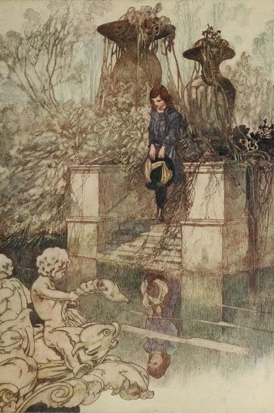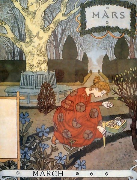 Editor: This is "La Belle Jardiniere – February" by Eugène Grasset, made in 1896. It’s a watercolor and mixed media piece. I’m immediately struck by the contrast between the delicate snowdrops and the rather somber-looking woman tending to the winter garden. How do you interpret this juxtaposition? Curator: It’s a fascinating tension, isn't it? Grasset, working within the Art Nouveau movement, often explored the feminine ideal. Consider the title: "La Belle Jardiniere," the beautiful gardener. This woman, rendered with careful detail, is participating in the act of cultivation, a traditionally feminine role connected to nature and growth. Editor: Right, she’s literally pruning for future growth. But her attire and expression seem almost at odds with that. She looks very serious. Curator: Exactly. The Art Nouveau period, despite its celebration of beauty, was also a time of great social change and evolving roles for women. This image, seemingly a celebration of pastoral life, might also hint at the burdens and expectations placed upon women of that era. The snowdrops, while beautiful, are fragile and represent the fleeting nature of beauty, especially during winter's starkness. Consider also the frame surrounding the image, it encloses her into this "feminine" space. What power relations do you observe? Editor: So you're saying it’s not just a pretty picture, but a comment on the position of women in society at the time? The garden could be a metaphor. Curator: Precisely! Art Nouveau artists were often invested in expressing their views on politics, and Grasset could be critiquing the limitations imposed on women, even within seemingly idyllic settings. The image asks: is she cultivating only a garden, or also something more? Is it truly "hers?" Editor: I hadn't thought about it that way at all. I just saw a pretty illustration. This is much more complex. Curator: Indeed, by engaging with feminist theory and social history, we can read a painting beyond the superficial and acknowledge the multifaceted dialogues the art may participate in. The more we question what's missing from the image, or made apparent, the more insight we uncover about historical truths.