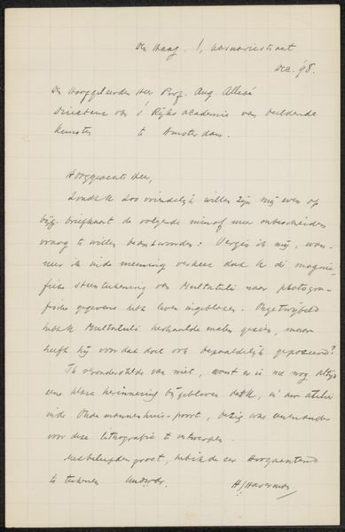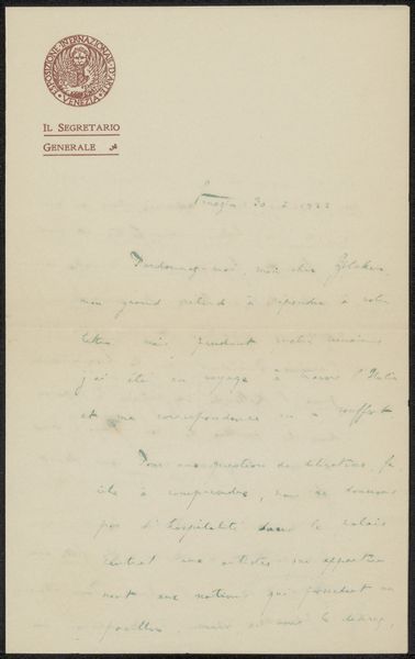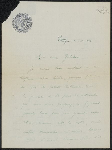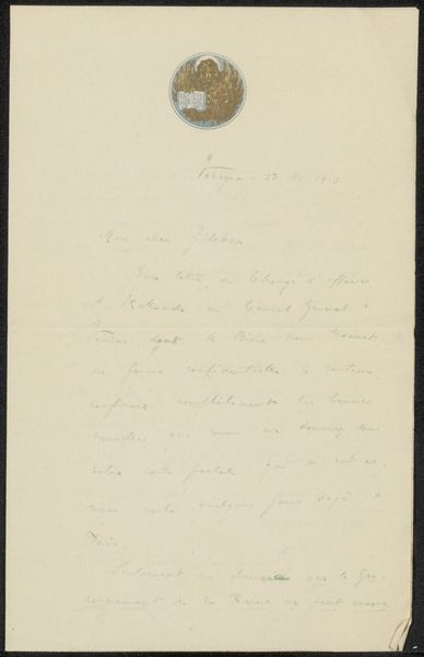 Curator: Looking at "Brief aan Philip Zilcken," quite likely from 1913, it feels as if we are encountering a fragment from a life, written in ink on paper. Editor: Oh, absolutely. I get an intimate feeling right away—a sense of whisper quiet intentions from another time. The handwriting is beautiful but challenging; like a half-forgotten song. Curator: The text, done with such careful calligraphy, represents more than simple communication, it illustrates the cultural emphasis of correspondence from that era, prior to the dominance of instantaneous forms of dialogue we take for granted now. We may assume it was of great value to Pica to carefully craft this personal object for Zilcken. Editor: I am intrigued by the slight golden circular design that tops the handwritten passage—the placement feels as though it is the head upon which the flowing text finds its stance. Curator: This portrait-oriented presentation is quite considered. And that detail speaks to the conventions of letter-writing and the epistolary genre in a way that reveals aspects of class and intellect. There are many hidden factors at play here that determine how information flows through society at that moment. Editor: Exactly. What's communicated between these two men goes so far beyond simply the ink and paper. We are party to the residue of feelings in that gesture of sending thoughts across space. How vulnerable they become, and, conversely, how potent! Curator: Precisely. Letters themselves serve as social texts and can give voice to intimate perspectives or the larger ambitions that the dominant culture imposes on such voices. Editor: Thinking about how precious this sort of physical exchange once was makes it even more poignant—and a little bit envious for someone who writes endless e-mails, rather than heartfelt correspondence. It serves as a powerful invitation to seek out connections in a less fleeting way.