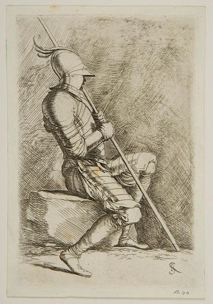 Editor: This etching, "Soldier on the Shore of a Pool of Water" by Salvator Rosa, captures a solitary figure. The intricate lines create a rather somber mood, don't you think? What strikes you most about the composition? Curator: Observe how Rosa employs a dense network of lines to sculpt the soldier's form and the rugged landscape. The figure's posture, leaning heavily on the staff, introduces a diagonal that is echoed in the rocky outcrop, creating a visual rhyme. The light, such as it is, falls across the armor. Editor: So, it's the arrangement of lines and shapes that carries the meaning? Curator: Precisely. Rosa masterfully orchestrates these formal elements to evoke a particular aesthetic experience. The visual relationships are paramount. Editor: I never considered the diagonal lines echoing in the rocks and figure. It's all in the details. Curator: Indeed, close observation allows for richer understanding.