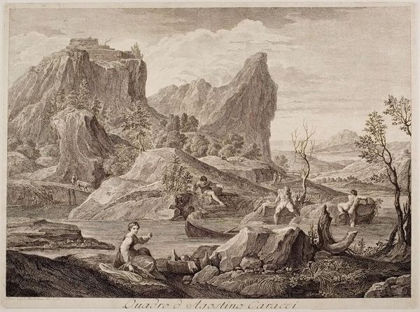 Editor: This is "Italian Bandits" by François Vivares, held at the Harvard Art Museums. It’s a detailed scene; the textures are really capturing my eye. What can you tell me about it? Curator: Vivares' engraving prompts us to consider the social dynamics of image production and consumption in his time. The choice of subject matter, Italian bandits, exoticizes the working class. How does the print medium make this accessible to a broader audience? Editor: So the printmaking process democratizes this scene? Curator: Exactly. It’s no longer a unique painting for the elite, but a mass-produced image consumed within a specific social and economic context. It lets us think about value, labor, and class. Editor: That gives me a completely different perspective! Thanks! Curator: My pleasure. The materials tell a story.