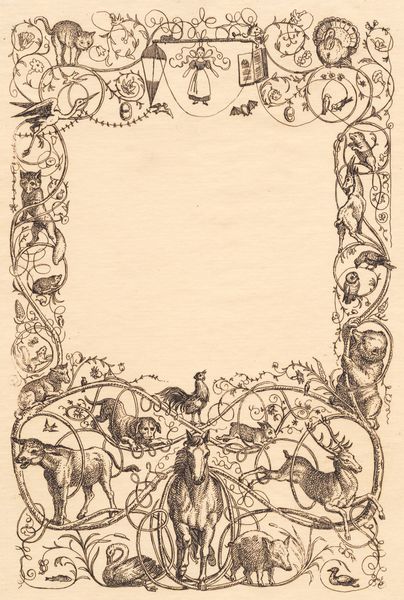 This illustration for "Halvhundrede Fabler for Børn" by Martinus Rørbye presents a delicate interplay of form and text. The monochromatic palette and precise lines, executed with ink on paper, create a visual harmony that evokes the intimacy of a hand-crafted book. The composition features a central block of text framed by an elaborate border of animals and foliage. This arrangement invites us to consider the relationship between nature and language. The animals—cats, birds, dogs, horses, and swans—are rendered in meticulous detail, their forms intertwined with the sinuous curves of leaves and vines. This union of organic and representational elements hints at a deeper connection, suggesting that stories emerge from and reflect the natural world. The artwork's structure destabilizes traditional hierarchies, blurring the line between illustration and text. It challenges us to reconsider how meaning is constructed through the interplay of visual and literary elements.