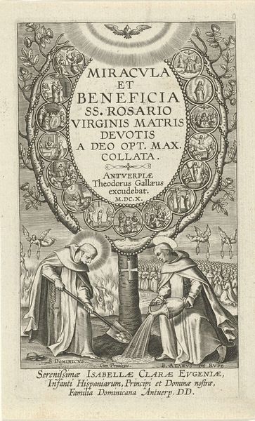 Theodoor Galle created this engraving, "Titelprent voor Speculum Illustratum Virginum," in Antwerp during a period of religious and social transformation. Galle situates the concept of ideal womanhood within a complex framework of religious virtue and societal expectation. Central to the image is the Latin text, framing the idea of virgins as mirrors (“Speculum”) of varied virtues. This reflects a time when the identity of women was closely linked to their perceived moral purity and their role in upholding social order. The figures flanking the text symbolize faith and charity, virtues that were highly valued in women. Galle’s work invites us to reflect on the historical construction of female identity and its relationship to religious and cultural values. It prompts us to consider how these historical representations affect contemporary understandings of gender, inviting a deeper engagement with the emotional and personal dimensions of navigating identity within societal expectations.
