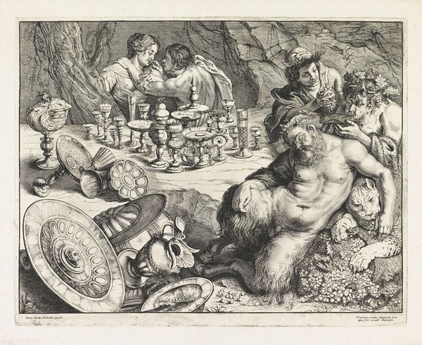 Editor: Frans van den Wyngaerde's "Bacchus and Drunken Silenus" depicts a chaotic scene of revelry. The abundance of objects seems to suggest prosperity. What symbols stand out to you? Curator: The figure of Silenus, Bacchus’s tutor, is key. His drunken stupor, supported by satyrs, reflects the loss of control and wisdom associated with intoxication. It is juxtaposed with the opulent tableware suggesting worldly pleasure. What cultural narratives do you think the artist explores here? Editor: Perhaps the tension between indulgence and enlightenment, the blurring of boundaries between humans and beasts? Curator: Precisely. The leopard, also associated with Bacchus, further emphasizes this connection to instinct. These recurring motifs of classical antiquity, often signal a reflection on human nature. It makes you wonder what it meant to people from that time. Editor: I’ve never thought about it that way. Thanks! Curator: My pleasure.
