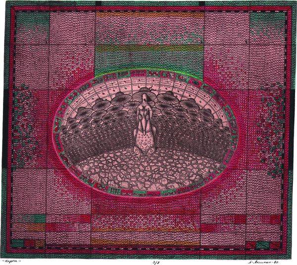 Oleksandr Aksinin’s “The Golden Cockerel” is a complex image, likely made with ink and colored pencils. Look at the way he’s built up the surface with tiny, methodical marks, like a kind of obsessive, beautiful knitting. The colors are so vibrant; pinks, oranges, greens, and black, creating a kind of hallucinatory folk art. There’s this incredible tension between the flat, patterned areas and the illusionistic space he’s trying to create with those long, dark shadows. Notice the way the cockerel rises above all the other figures and forms: is he a symbol of power, or just a goofy bird perched on top of a strange totem? Aksinin seems to have been influenced by the Symbolist movement and artists like Gustav Klimt, who were also interested in exploring psychological states through ornamental and decorative forms. Aksinin's work invites us to embrace ambiguity and see the world as a space of infinite possibilities, where symbols and meanings are constantly shifting and transforming.