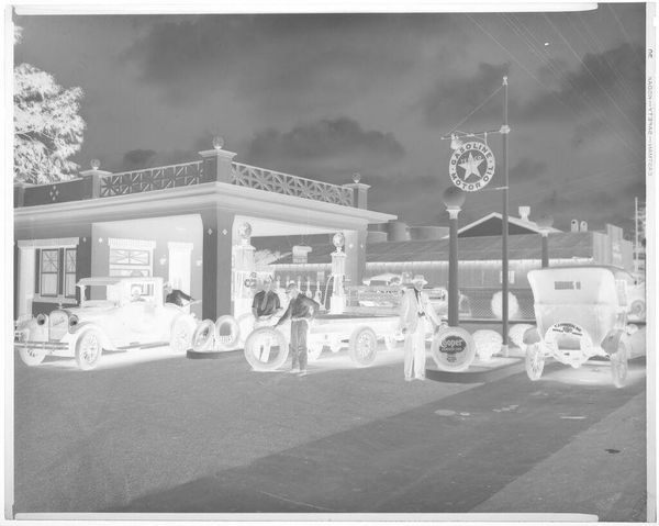Editor: This intriguing vintage photograph by Harry Annas, titled "Untitled (men standing with Lockhart Distributing Co. trucks for Pearl beer)," presents a fascinating composition. What structural elements stand out to you? Curator: The inverted tonal range immediately commands attention, disrupting conventional perception. Note how the stark contrast and geometric precision of the vehicles create a structured foreground, drawing the eye toward the figures. The spatial arrangement suggests a deliberate construction, wouldn’t you agree? Editor: I do. It’s as if the trucks and the men are all arranged elements within a staged tableau. Curator: Precisely. The linearity inherent in the trucks contrasts intriguingly with the solid facade of the building, creating a dialogue between forms. Considering this interplay, how might one interpret the relationship between surface and depth within this image? Editor: That interplay really emphasizes the flat, almost theatrical quality of the image, while creating depth. I see now how formal analysis brings this to life. Curator: Indeed. By focusing on the formal elements, we begin to see the underlying structure and the deliberate choices made by the photographer.