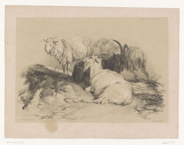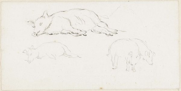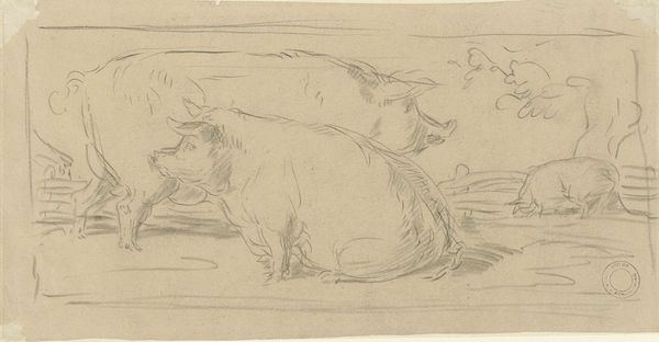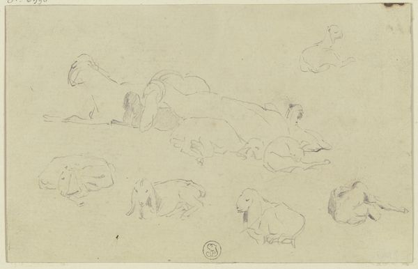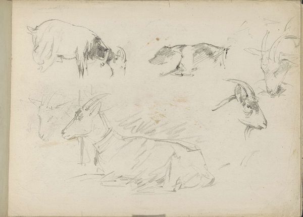 Johannes Tavenraat rendered this graphite composition of resting animals and portraits. The arrangement of the sketches across the page creates a dynamic interplay of form. Loose, gestural lines define the contours of goats, a horse, and men’s heads, giving each figure a sense of volume without fully enclosing them. This technique invites the viewer's eye to complete the forms, participating in the visual experience. The interplay of light and shadow, achieved through subtle gradations of graphite, enhances the texture and dimensionality. The use of hatching creates tonal depth, particularly noticeable in the rendering of the reclining goats. By employing such open-ended, yet precise mark-making, Tavenraat challenges conventional representational strategies, prompting us to reconsider the relationship between perception and artistic representation.