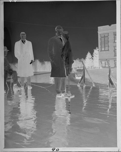 Editor: This intriguing photograph, *Untitled (two boys ice skating)* by Lucian and Mary Brown, presents an inverted view of a winter scene. The stark contrast really emphasizes the composition—the boys, the trees, and the ice itself. What do you focus on when you look at this image? Curator: The formal elements command attention. Notice the stark lines created by the inverted color palette. The contrast between the boys' figures and the darker background—how does it affect your reading of depth and form? Editor: It almost flattens the image. Curator: Precisely. The inverted tones challenge our perception, inviting consideration of light and shadow as structural components. Do you find that the figures' placement and scale contribute to the image's overall balance? Editor: They seem to be in conversation with the trees. I appreciate that now. Curator: Indeed, form and composition, working together, create a compelling viewing experience.