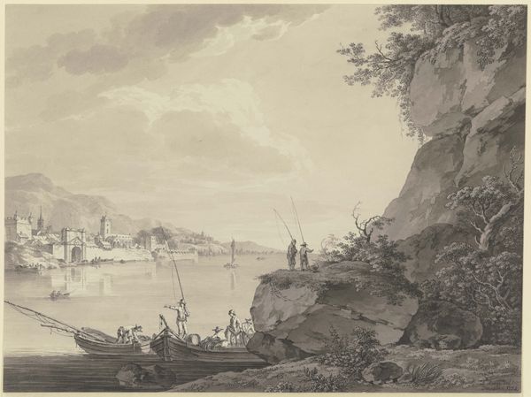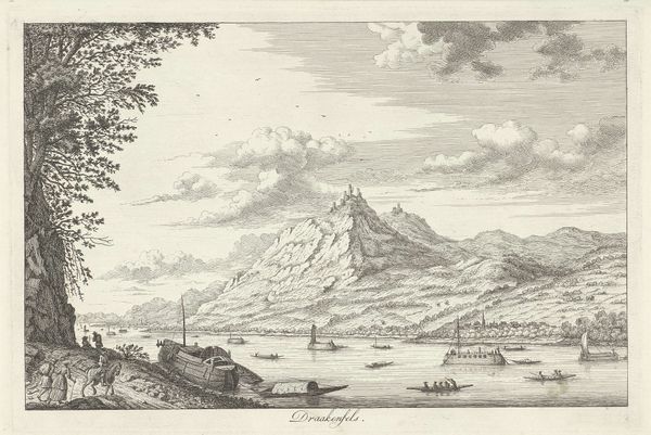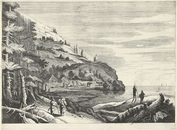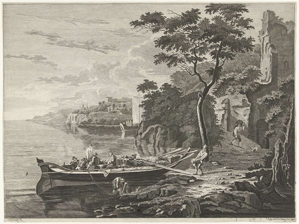 Curator: Immediately, I am drawn to the activity, the tension—a whole community working together! Editor: Indeed. Let’s delve into "Italian Landscape with Fishermen," a print crafted by Willem van Lande around 1635 to 1650. The artist worked with engravings, demonstrating both a landscape and genre-painting sensibility in a Baroque style. It's realism imbued with Baroque dynamism. Curator: The pulling… it reminds me of communal labor rituals, of shared burden and shared reward, but with something more… it evokes a certain vulnerability; humans subjected to labor as a fact of their condition. What can you tell me about its imagery? Editor: Well, landscapes in Dutch art often carry symbolic weight, reflecting societal values or commenting on humanity's place in the world. Fishing, in particular, can represent reliance on nature's bounty, but also alludes to biblical associations; in effect, human labor provides and serves. Van Lande places them centrally in the landscape, which both monumentalizes and submits their labor, almost as if it were the very pulse of the setting itself. Curator: That makes me think of other artists portraying similar labor… Is there anything historically significant here in its context? Is he commenting on their access to market? Was he a patron of social change or awareness? Editor: Lande was influenced by a broad school of artistic production around Haarlem in the 17th century. However, most sources place this engraving as a part of a larger catalog that included a few named pieces in the Baroque tradition. He could simply be re-imagining older tropes without overtly challenging or even participating in discourses around production. But this makes me return to your previous comments, about the sense of emotional, primal labor. Curator: That the fishermen look so closely interwoven with the landscape; the very act of pulling is like pulling a thread through reality. Even at rest the figures appear in states of labor; very baroque in sensibility! Editor: The work underscores enduring patterns. These types of visual images had the potential to subtly reinforce the symbolic and lived relationship between land, labor and society; very baroque, yes! Curator: Indeed, the landscape's a palimpsest for human hands. Thanks to all these points, the image resonates long past its creation. Editor: It certainly does; a reminder of the stories embedded within seemingly simple scenes.