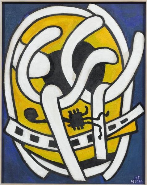Curator: Fernand Léger's "Composition on Yellow Background (Green Logs)," from 1954. A rather peculiar title given its visual complexity! Editor: Oh, it’s definitely…loud. It’s got this sort of bold, almost aggressively happy vibe to it, doesn’t it? The colors feel like they're trying to shout over each other, contained, however, within this irregular but prominent yellow "form" that frames the composition and against the background. Curator: Yes, this work exemplifies Léger's late-period focus on juxtaposing abstracted forms with everyday objects, blurring the lines between representation and abstraction. Notice how the 'logs,' while abstracted, retain a sense of weight and mass through his use of dark blues, greys, and greens in contrast to lighter colours that surround them. It is constructed of mixed media, primarily painting on perhaps a canvas. Editor: Mass indeed, I feel a physical presence. I love how the geometric shapes kind of clumsily crash into one another! And the linework gives the piece this scrappy, almost comic book energy. Léger’s really forcing us to question what’s 'foreground' and 'background,' and 'form.' Is it supposed to mirror his love for the dynamism of machinery, do you think? Curator: Indeed! His post-war works demonstrate a deep interest in modern production. The flattened perspective and bold outlines are very much a visual vocabulary borrowed from commercial art. The "logs" may evoke the industrial processing of materials; this also brings attention to labor in the art-making practice itself as well as the processes of societal production. Editor: This resonates. But there’s a warmth to this…industrial feel, a raw joy almost. Léger takes these potentially cold, manufactured forms and infuses them with this exuberant, almost playful spirit. It challenges this binary you’re talking about in industrial versus fine arts... I wonder, do you think Léger succeeded in reconciling those apparent opposites here? Curator: Well, it remains an active conversation among critics, to your point! However, I will note that in examining it so closely together today, perhaps there is a kind of harmony amidst the chaos. It embodies the potential of a shared cultural language formed in response to a constantly and quickly changing society. Editor: A stimulating exchange. It leaves you thinking long after you’ve turned away, doesn’t it? Thank you!