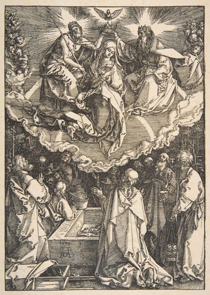 Albrecht Durer created this woodcut illustration to Revelationes Sancte Birgitte. Dürer, who lived through significant religious and social upheaval, including the early stirrings of the Reformation, was deeply interested in questions of faith and salvation. Here we see Saint Bridget of Sweden riding a horse. She is accompanied by a procession of followers. Above her, a ladder stretches towards a vision of Christ and the Virgin Mary enthroned amidst angels and saints. Bridget, a mystic and a noblewoman, experienced visions throughout her life, which she documented in her "Revelations." This image is interesting in that it portrays a woman's spiritual journey, visualizing the connections between earthly life and divine revelation. Consider the emotional intensity Durer evokes, making the viewer feel connected to the saint’s experience. It invites us to reflect on the power of personal faith and challenges traditional religious authority by emphasizing individual spiritual experiences.