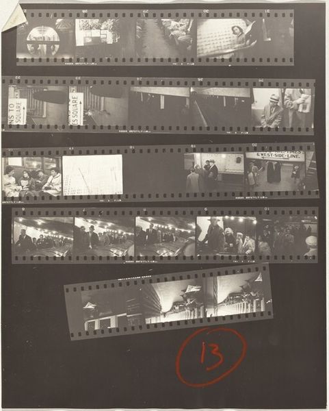 Curator: Robert Frank's "Paris 24," captured in 1959, presents a compelling view of the city through a series of images on what appears to be a gelatin-silver print contact sheet. Editor: The initial impression is rather melancholic, wouldn’t you say? The sequential arrangement offers a fractured narrative, a somber glimpse into Parisian life. Curator: Precisely, and that's key to Frank's process. The layout invites a reading akin to cinematic montage, though stripped bare. We observe high-contrast, stark compositions; note the emphasis on the grainy texture, adding layers of depth and raw immediacy. Editor: Right, the grainy effect also highlights the social climate of the time; this artistic choice speaks volumes about the lived experience in postwar Europe, particularly considering his position as an outsider. It's far from the picture-postcard views we might expect. There are snippets here: what looks to be an early Christmas lighting display and also images from political demonstration, perhaps even unrest. Curator: True, and considering Frank's background—a Swiss-born artist engaging with American and European subject matter—his perspective becomes all the more vital. Structurally, note how he employs light and shadow, essentially constructing a visual rhythm. Certain frames emphasize horizontal lines, creating a sense of spatial depth and then these vertical lighting features offering the up and down beats as we traverse each line of images. Editor: Considering his involvement with the Beat Generation, "Paris 24" is not only a visual study, it's an exploration of existentialism and social observation that resonates deeply. Curator: Agreed. By avoiding traditional aesthetic conventions, Frank subverts our expectations and invites active engagement. The medium, the compositional approach—each element serves a specific function within the overall framework of his artistic statement. Editor: This offers such insight, highlighting the social narratives while breaking down how its structures serve meaning and feeling, even all these years later. Curator: And revealing Frank's enduring impact as a master of both form and photographic narrative.