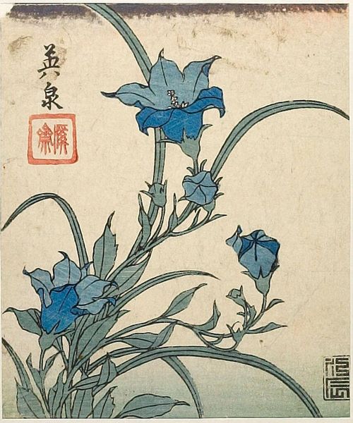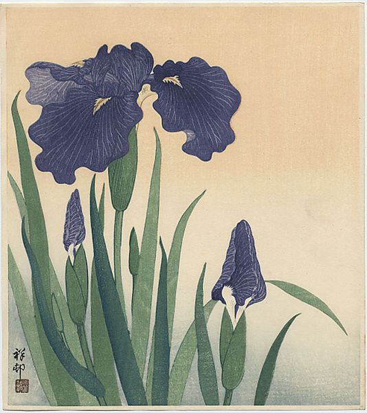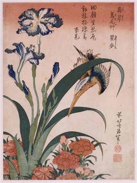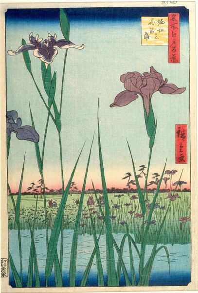 Editor: This woodblock print is "64 (56) Horikiri Iris Garden" by Utagawa Hiroshige, created around 1857. I find it incredibly peaceful; the way the irises tower over the landscape creates such an intimate view. How do you interpret this work? Curator: I see here an intentional layering of cultural memory. The iris itself, *kakitsubata*, is associated with narratives of elegance and refined melancholy in Japanese literature, evokes a sense of fleeting beauty and *mono no aware*. Look how Hiroshige positions the viewer low to the ground, surrounded by these symbolic irises. What feeling does that proximity evoke for you? Editor: I feel drawn in, almost like I'm hidden in the garden myself. Does the vantage point mean something? Curator: Exactly! The vantage point is critical. In traditional Ukiyo-e prints, this kind of intimacy suggests a desire to connect the viewer directly with the themes of nature and transience, key tenets of Zen Buddhism influential at the time. Furthermore, consider the perspective and the limited color palette. Editor: I can see that now – the bold foreground and hazy background create depth, even though the color range is quite restricted. It almost feels like a stage. Curator: A stage indeed! It echoes Noh theatre aesthetics where symbolism and subtle gestures carry profound emotional weight. The figures are moving almost ritualistically, no? These details combine to create an immersive scene steeped in history and contemplation. Editor: That connection to theatre makes a lot of sense! I never would have picked up on that on my own. Curator: These prints invite us to become part of an unfolding narrative, subtly nudging us to recall shared cultural meanings. Editor: I will look at ukiyo-e with much greater interest from now on, thank you! Curator: And I, in turn, am grateful for your perspective and thoughtful analysis.