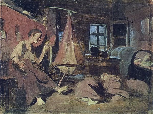 Curator: Here, we see "Cottage Interior," an 1840 oil painting by David Cox. What springs to mind when you first encounter this scene? Editor: A certain kind of quiet desperation, actually. Like a warm, sun-drenched melancholia. You can almost smell the dampness and feel the hard-worn surfaces. Curator: Indeed. Note Cox's emphasis on tonal values to articulate spatial relationships. The interior’s dimly lit zones contrast sharply with the radiant outdoor light, enhancing the sense of depth. Observe the brushstrokes, energetic and textured—impasto marks lend materiality. Editor: It’s like time is thick here, pressing down on everything. See how the figures almost blend into the background, part of the weathered environment? Curator: Precisely. Cox departs from the idealized rural depictions common in his time. "Cottage Interior" engages with genre painting conventions but strips away overt sentimentality. We focus on the formal elements rather than narrative charm. The women’s figures aren’t subjects as much as anchors that ground the interior, linking its aesthetic to the material realities. Editor: I think the subdued palette enhances that—earth tones mingling with grays and smoky blacks. No flashy colors to distract. Only the glow of the fire breaks it. Does this relate to Romanticism at all? Curator: Its engagement with quotidian subjects positions it tangentially within the Romantic aesthetic, though we understand that Cox’s artistic vision diverged in many important ways. What we recognize in his paintings are experiments in depicting light and spatial depth through texture and pigment. Editor: It’s strange. Looking closer at "Cottage Interior," the shadows have their own sort of vibrant quality—like ghosts dancing to an inaudible song. The fireplace itself becomes this weirdly inviting, cavernous space, and even the humblest everyday routines begin to resonate with something profound. Curator: An interesting observation. Ultimately, the painting encourages contemplation beyond its straightforward subject, wouldn’t you agree? Editor: Absolutely. It’s a somber echo you can almost touch. A slice of existence presented raw, without any adornment—honest as daylight—in all of its shadows.