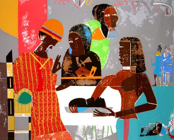 Varnette Honeywood's "Generations of Creative Genius" is like a joyful collage built from color and pattern, maybe made with paper or paint, it's hard to tell! Honeywood creates a world with flat planes of color, and playful lines to create her four figures. It’s like she’s building up an image, block by block, inviting us to revel in the sheer act of making. Look at the background, each blue square filled with a slightly different shape. It’s repetitive, but not, suggesting that creation comes from a continuous process of trial and error, each iteration slightly different from the last. The artist, with her paintbrush, seems to be referencing the whole history of art-making, like a painter, a sculptor, and a musician combined. It reminds me of Stuart Davis, who also had that way of abstracting and building an image in bright color, flat shapes, and hard-edged lines. It's art as a conversation, a back-and-forth across time, where the meaning isn't fixed, but always in motion.